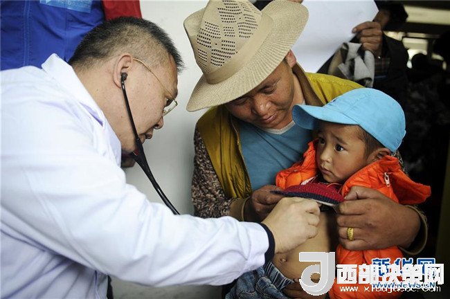 7月12日,在西藏那曲,醫(yī)療專家為貧困先心病患兒做檢查。