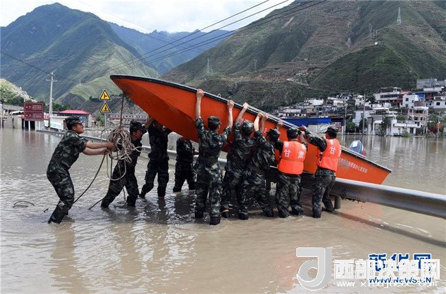 7月15日,在舟曲縣南峪鄉(xiāng),武警甘南支隊戰(zhàn)士在搬運沖鋒舟。