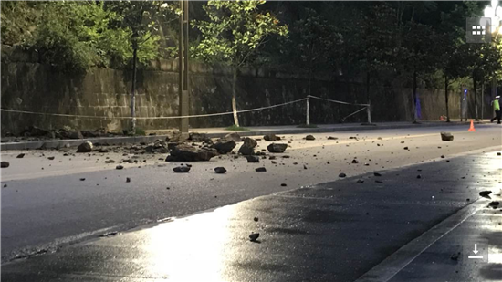 接到報(bào)警后,大隊(duì)及專職隊(duì)迅速出動(dòng)兩輛消防車和10名官兵趕赴現(xiàn)場(chǎng)進(jìn)行處置,到達(dá)現(xiàn)場(chǎng)后,指揮員迅速帶領(lǐng)4名戰(zhàn)斗員立即對(duì)險(xiǎn)情進(jìn)行偵查。通過現(xiàn)場(chǎng)偵查,發(fā)現(xiàn)在距離路面高約50米的山梁上,幾個(gè)石塊直徑約1米大小,由于連續(xù)幾日暴雨,石塊下土層已經(jīng)流失,導(dǎo)致石塊部分懸空,隨時(shí)都有掉落的危險(xiǎn)。此時(shí)已近夜晚,模糊不清的環(huán)境無形中增加現(xiàn)場(chǎng)處置的難度。指揮員下令,分兩組進(jìn)行處置,一組由5名戰(zhàn)斗員跟隨一名熟悉該山道路的群眾一起上山,處置"懸石”險(xiǎn)情,一組與交警部門拉起警戒線隔離過往車輛和行人。由于“懸石”處無路可通,戰(zhàn)斗員在上到山梁后,系上安全繩下降到懸石旁利用事先準(zhǔn)備好的鋼釬對(duì)石塊進(jìn)行起拗,在經(jīng)過兩個(gè)多小時(shí)的作業(yè)后,全部懸石終于掉落路面,使隱患徹底消除。
