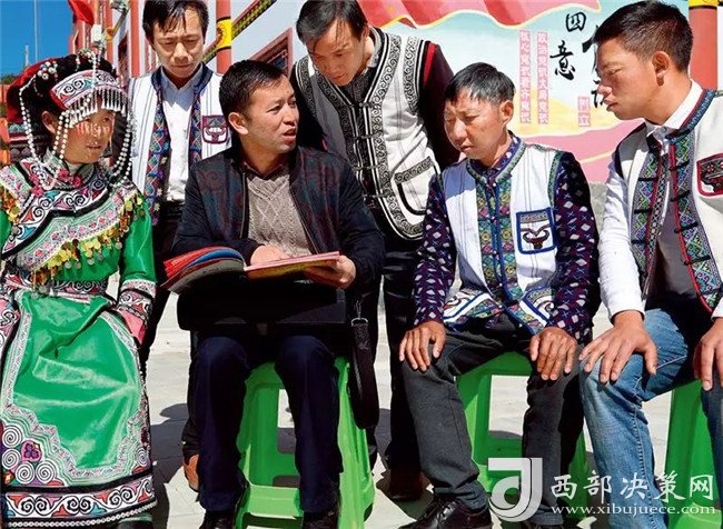 貴州省六盤水市鐘山區(qū)大灣鎮(zhèn)海嘎村駐村第一書記楊波(前左二)向海嘎村彝族村民宣講十九大精神 劉續(xù)攝/ 本刊