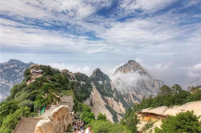 西峰海拔2082.6米,華山主峰之一,因位置居西得名。又因峰巔有巨石形狀好似蓮花瓣,古代文人多稱其為蓮花峰、芙蓉峰。袁宏道在他的《華山》中記述:“石葉上覆而橫裂”;徐霞客《游太華山日記》中也記述:“峰上石聳起,有石片覆其上,如荷花。”李白詩(shī)中有“石作蓮花云作臺(tái)”句,也當(dāng)指此石。