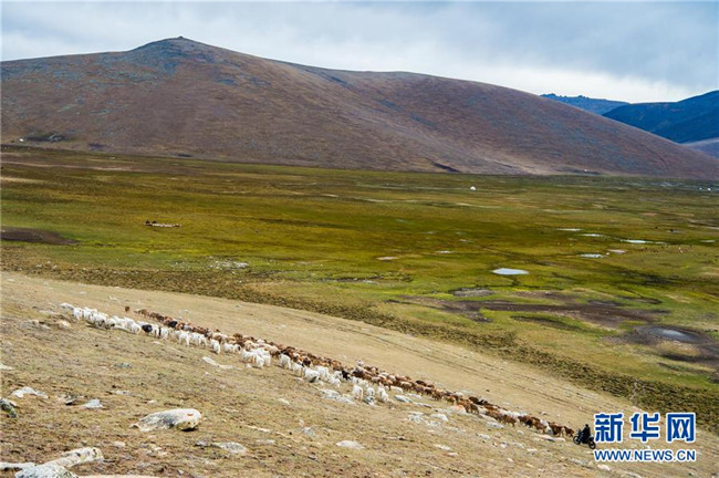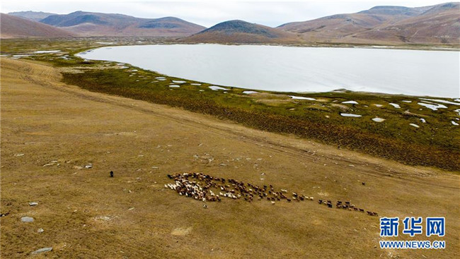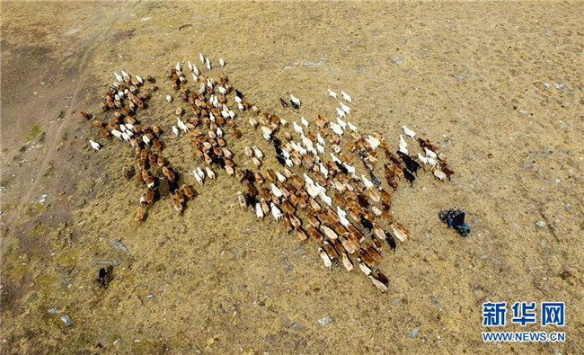 在青河縣查干郭勒鄉(xiāng)薩爾布拉克村,胡賽因·哈力都拉趕著羊群轉(zhuǎn)場(8月25日無人機(jī)拍攝)。新華社記者江文耀攝
