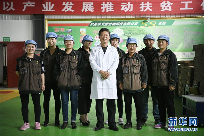 林玉清(左五)與當?shù)貑T工合影(8月30日攝)。來自福建莆田的林玉清2017年3月在西吉縣成立寧夏澤艾堂生物科技有限公司,依托西吉縣優(yōu)質的艾草種植條件,采用“公司+合作社+農戶”的訂單農業(yè)合作模式,與吉強、新營等鄉(xiāng)鎮(zhèn)種植專業(yè)合作社合作建成艾草種植基地11個、推廣種植艾草6000畝,為當?shù)厝罕娒撠氈赂讳伨托侣纷印P氯A社記者王鵬攝