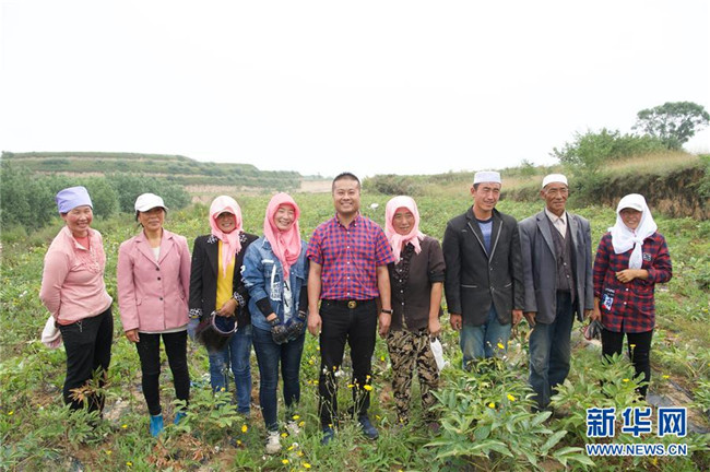 來自福建長樂的林錦云(右五)在寧夏固原市河川鄉(xiāng)與當?shù)剞r戶合影(8月28日攝)。2014年,林錦云通過土地流轉方式,承包了河川鄉(xiāng)1.5萬畝荒山,打造油用牡丹生產基地。目前,林錦云種下的7600畝油用牡丹已經開始受益,公司已就近吸納村民300多人就業(yè),其中建檔立卡戶39戶,人均年收入2萬多元。 新華社記者姜克紅攝