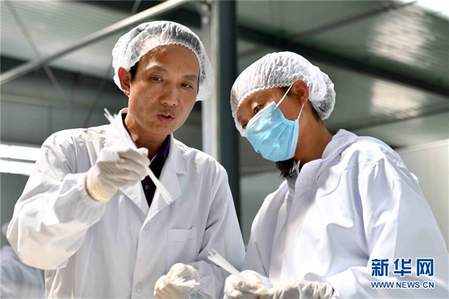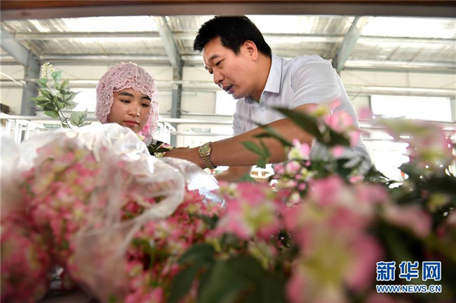 潘文賢(右)在寧夏固原市隆德縣隆德人造花工藝有限公司向員工介紹人造花制作技術(8月29日攝)。來自福建南安市的潘文賢2011年在隆德縣創(chuàng)辦隆德人造花工藝有限公司,成為隆德縣第一家集研發(fā)、生產和銷售于一體的勞動密集型出口創(chuàng)匯企業(yè),產品遠銷歐美及東南亞等國家和地區(qū)。截至2017年底,已成功打造隆德縣前莊村、紅崖社區(qū)等5個扶貧車間,幫助150人穩(wěn)定就業(yè)、218戶外加工戶靈活增收,帶動300多個建檔立卡戶增收脫貧。 新華社記者郭緒雷攝