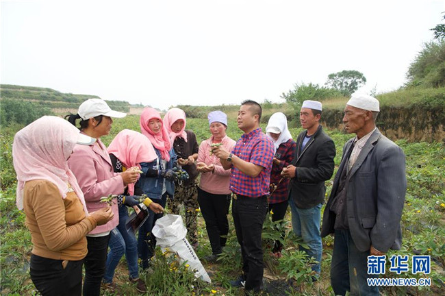 來自福建長樂的林錦云(右四)在固原市河川鄉(xiāng)向農戶講解采摘注意事項(8月28日攝)。2014年,林錦云通過土地流轉方式,承包了河川鄉(xiāng)1.5萬畝荒山,打造油用牡丹生產基地。目前,林錦云種下的7600畝油用牡丹已經開始產生效益,公司已就近吸納村民300多人就業(yè),其中建檔立卡戶39戶,人均年收入2萬多元。 新華社記者姜克紅攝
