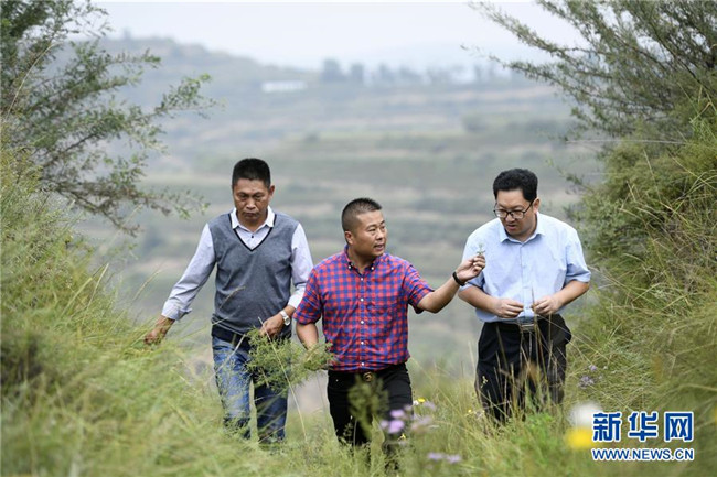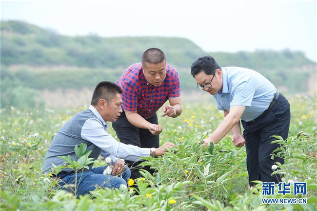 來自福建長樂的林錦云(中)在寧夏固原市河川鄉(xiāng)與福建對口支援農業(yè)專家(右)交流牡丹種植技術(8月28日攝)。2014年,林錦云通過土地流轉方式,承包了河川鄉(xiāng)1.5萬畝荒山,打造油用牡丹生產基地。目前,林錦云種下的7600畝油用牡丹已經開始產生效益,公司已就近吸納村民300多人就業(yè),其中建檔立卡戶39戶,人均年收入2萬多元。 新華社記者姜克紅攝