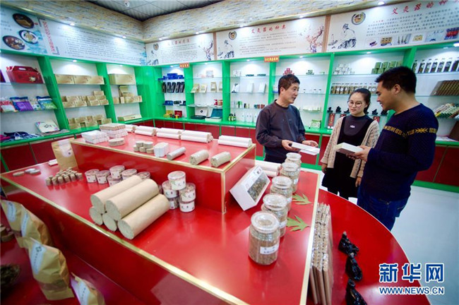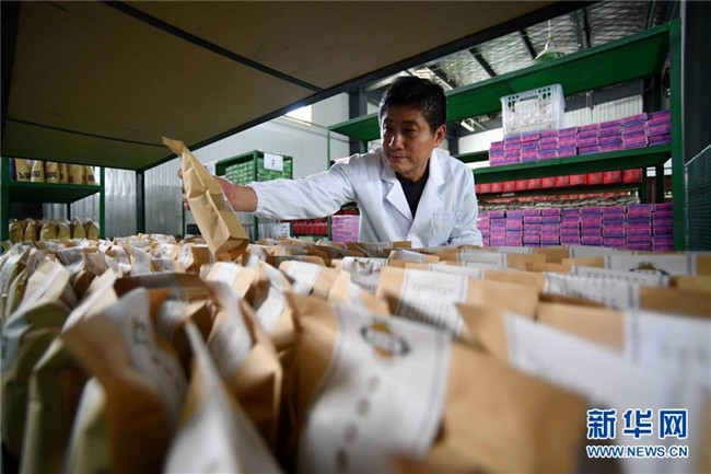林玉清在寧夏固原市西吉縣寧夏澤艾堂生物科技有限公司查看艾草產品(8月30日攝)。來自福建莆田的林玉清2017年3月在西吉縣成立寧夏澤艾堂生物科技有限公司,依托西吉縣優(yōu)質的艾草種植條件,采用“公司+合作社+農戶”的訂單農業(yè)合作模式,與吉強、新營等鄉(xiāng)鎮(zhèn)種植專業(yè)合作社合作建成艾草種植基地11個、推廣種植艾草6000畝,為當?shù)厝罕娒撠氈赂讳伨托侣纷?。新華社記者郭緒雷攝