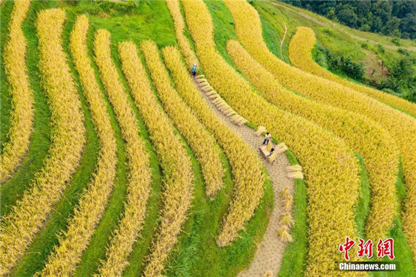 9月11日,航拍貴州省榕江縣陽開梯田秋色,農民在田間勞作。中新社記者 賀俊怡 攝