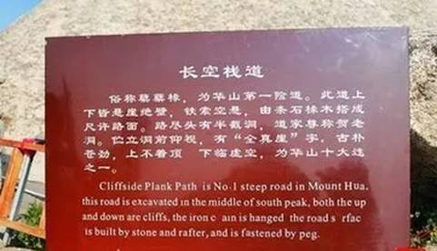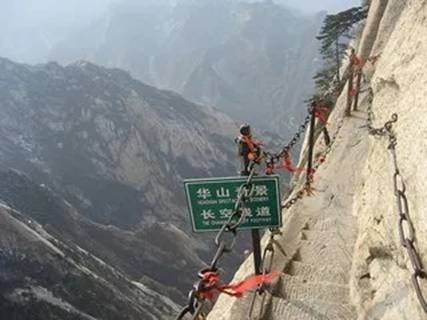在約2160米高的峭壁上鑿出踏腳之處,鑲嵌石釘搭木椽并用鐵索固定建造的一條懸空棧道,那就是長(zhǎng)空棧道。它位于華山極頂南峰東側(cè)南天門(mén)外的山腰間,經(jīng)燕子叼表、朝元洞,踩崖隙凌空懸梯下10余華山長(zhǎng)空棧道米,沿附懸崖而搭寬不盈尺的方木棧道至全真巖下。
