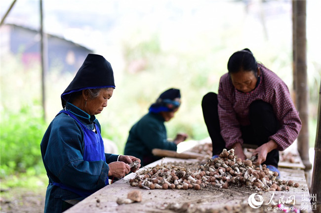 10月10日,村民在貴州省黔東南苗族侗族自治州丹寨縣排調(diào)鎮(zhèn)也改村姬松茸種植基地對剛采摘的姬松茸進行削根處理。楊武魁 攝