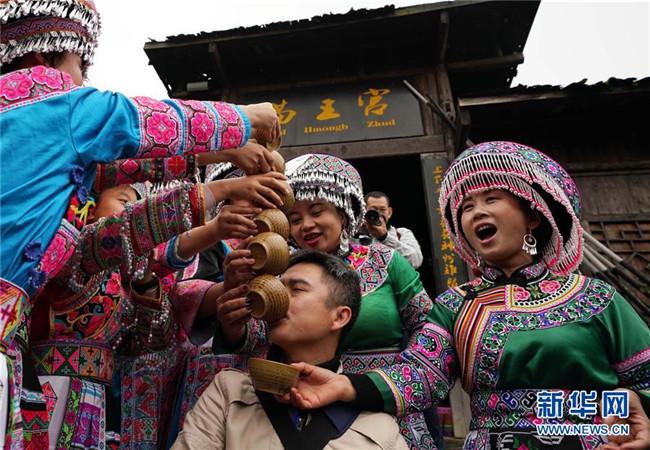 10月14日,在興文石海世界地質(zhì)公園內(nèi),工作人員為遠(yuǎn)道而來的游客敬酒。