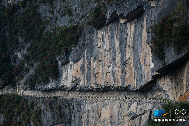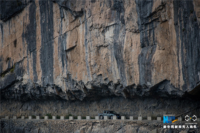 經(jīng)過一年多的時間,村民終于人工鑿出這條595米的懸崖公路,給當?shù)貛砹讼M?。新華網(wǎng) 李相博 攝