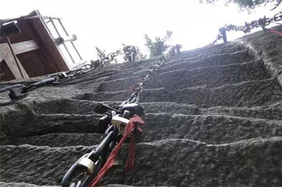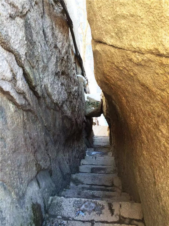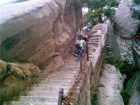 “千尺幢”在華山峪古道“回心石”上,是經(jīng)華山峪登主峰的必經(jīng)之道。這里原為一崖間裂隙,直立70度,后來人們沿隙鑿?fù)爻陕罚惺A370級(jí),階寬僅容半足,游人登臨時(shí),仰視一線天,俯視若臨深井。