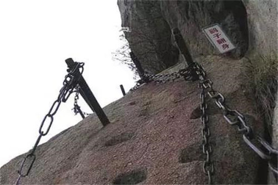 在南天門外,是華山著名險(xiǎn)道之首“長(zhǎng)空棧道”。棧道路分三段,出南天門石坊至朝元洞西,路依崖鑿出,長(zhǎng)20米,寬二尺許,是上段;折向下行,在崖隙間橫貫有鐵棍,形如凌空懸梯,游人須挽索逐級(jí)而下,稱之“雞下架”,是中段;西折為下段,筑路者在峭壁上鑿出石孔,楔進(jìn)石樁,石樁之間架木椽三根,游人至此,面壁貼腹,腳踏木椽橫向移動(dòng)前行。這里只是探險(xiǎn)之道,并非登山必由之路,膽小的游客觀望一下即可,體力和膽量沒有把握則不要輕易冒險(xiǎn)。所以石刻上不少警告之語(yǔ),如“懸崖勒馬”等。