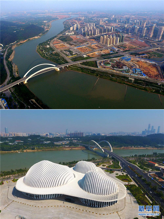 拼版照片。上圖為建設(shè)中的廣西南寧市五象新區(qū)(2016年5月2日,新華社發(fā) 任鵬飛 攝);下圖為無人機航拍五象新區(qū)的廣西文化藝術(shù)中心(2018年10月22日,新華網(wǎng) 章佳禮 攝)