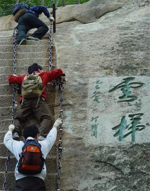 云梯,是從引鳳亭經(jīng)東石樓峰通往東峰的一段捷徑,云梯高十余米,與地面垂直呈90度角,中上部外突,呈倒坎崖之勢(shì)。梯上置懸索三條,游人挽索而攀,身體無(wú)法貼近崖壁,因而隨索擺動(dòng),心旌神搖,如同云駕霧,故名云梯。