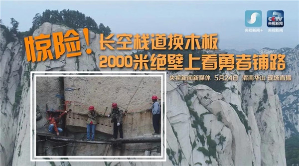 央視新聞?lì)l道對“華山長空棧道更換木板”進(jìn)行直播