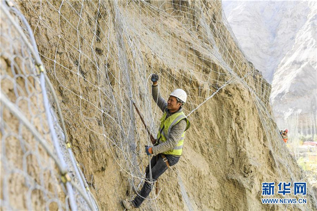 11月12日,在新疆塔什庫(kù)爾干塔吉克自治縣大同鄉(xiāng)鄉(xiāng)政府附近的一處路段,來自四川的吳飛在峭壁上安裝防護(hù)網(wǎng)。 近日,一支由四川、云南等地工人組成的施工隊(duì)忙碌在帕米爾高原深處的大山中,為塔什庫(kù)爾干塔吉克自治縣縣城至大同鄉(xiāng)道路的易落石路段安裝防護(hù)網(wǎng)。崇山峻嶺間,工人要攀爬至峭壁上施工作業(yè),如躍動(dòng)在大山間的“舞者”。據(jù)介紹,這支施工隊(duì)常年活躍在新疆山區(qū)道路的施工現(xiàn)場(chǎng),為風(fēng)險(xiǎn)路段加裝安全防護(hù)裝置,保障過往車輛和沿途村民出行安全。 新華社記者 胡虎虎 攝