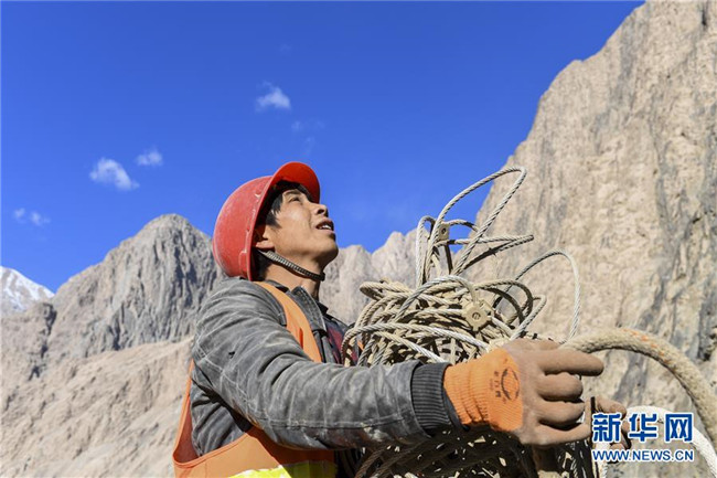 11月12日,在新疆塔什庫(kù)爾干塔吉克自治縣大同鄉(xiāng)鄉(xiāng)政府附近的一處路段,工人背著施工設(shè)備在峭壁上攀爬。 近日,一支由四川、云南等地工人組成的施工隊(duì)忙碌在帕米爾高原深處的大山中,為塔什庫(kù)爾干塔吉克自治縣縣城至大同鄉(xiāng)道路的易落石路段安裝防護(hù)網(wǎng)。崇山峻嶺間,工人要攀爬至峭壁上施工作業(yè),如躍動(dòng)在大山間的“舞者”。據(jù)介紹,這支施工隊(duì)常年活躍在新疆山區(qū)道路的施工現(xiàn)場(chǎng),為風(fēng)險(xiǎn)路段加裝安全防護(hù)裝置,保障過往車輛和沿途村民出行安全。 新華社記者 胡虎虎 攝