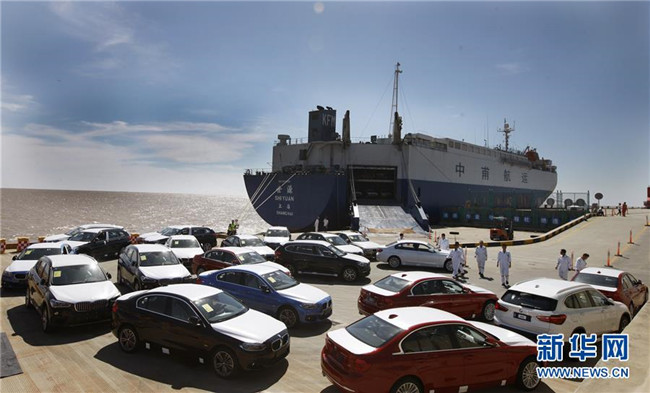 在位于上海臨港新城的自貿(mào)區(qū)滾裝碼頭上,工作人員將卸下船的車輛開(kāi)到碼頭指定停車場(chǎng)(2017年9月13日攝)。新華社記者方喆攝