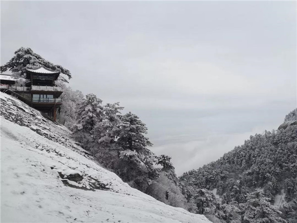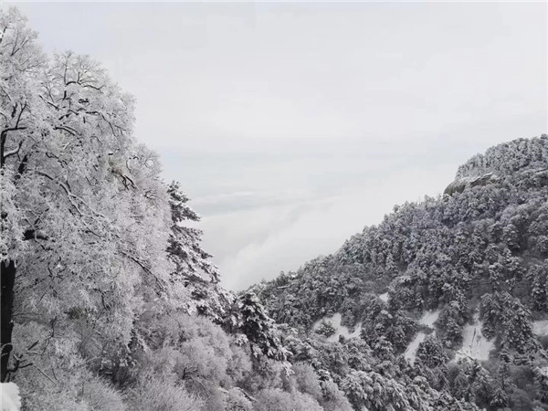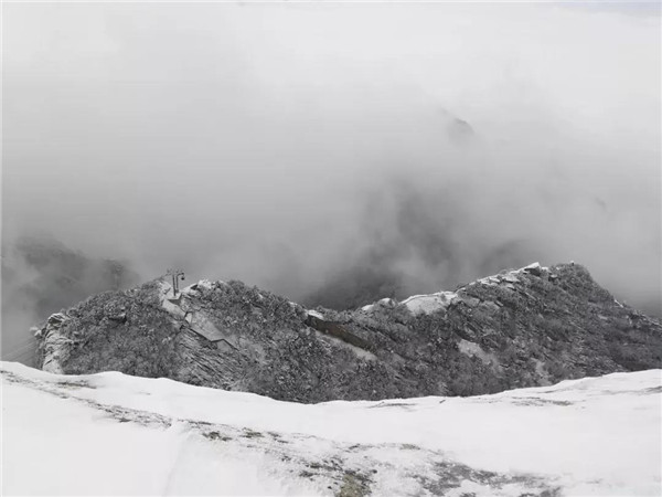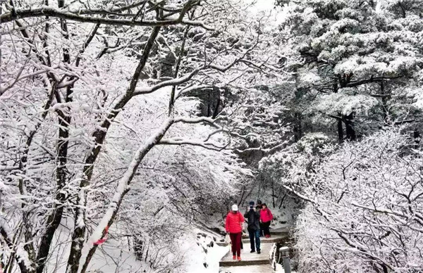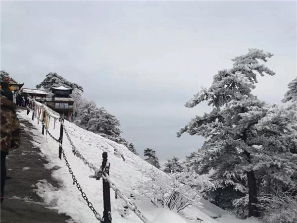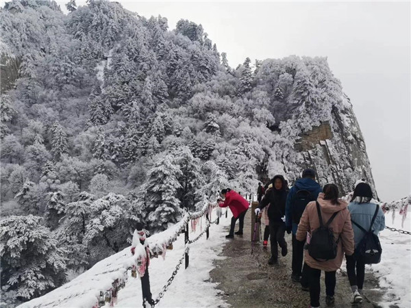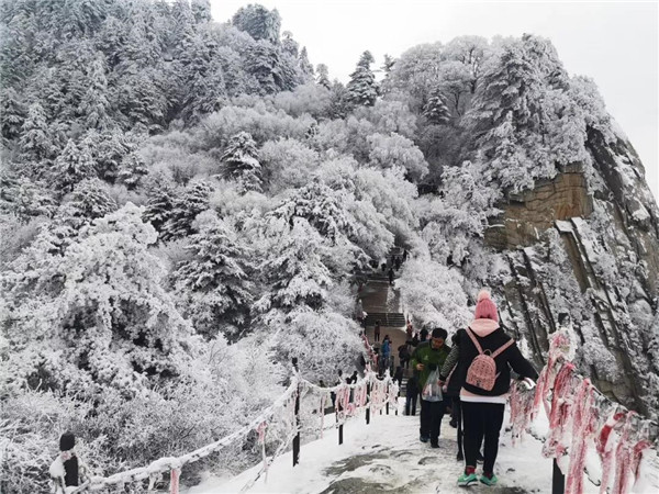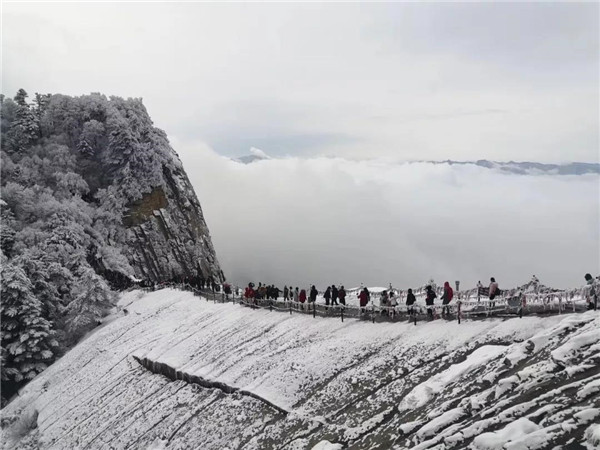 17日凌晨的一場(chǎng)大雪將西岳華山變成白雪皚皚的世界,白雪與蒼翠的華山奇松、靈動(dòng)的云海交相輝映,如夢(mèng)如幻;滿山遍野玉樹瓊花,樹枝上通體的霧凇晶瑩剔透,繪就冬日畫境,美不勝收,游人如置身人間仙境。