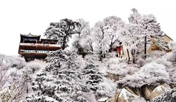 冬天的雪景——千峰筍石千株玉,萬(wàn)樹松蘿萬(wàn)朵銀。華山的雪景不僅是銀白的世界,而是猶如千姿百態(tài)的雪雕。雪霽,便有“林海玉樹”、“雪堆玉石”、“云中雪龍”、“巖崖雪屋”、“梨花飛揚(yáng)”、“天女散花”、“紅帶玉墜”等各具形態(tài)的奇特景觀。置身在雪的境界,神清氣爽,洗心革面,冰清玉潔,忘卻凡塵。