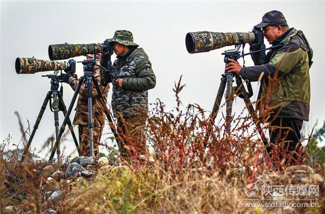 圖為11月21日幾名攝影愛(ài)好者在洋縣龍亭鎮(zhèn)鎮(zhèn)江村拍攝朱鹮。