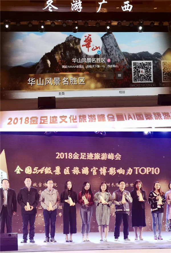 金足跡文化旅游峰會(huì)是由新浪網(wǎng)、微博打造的全國性旅游峰會(huì),是旅游行業(yè)的年度大會(huì)。本次峰會(huì)上發(fā)布了《2018全國旅游數(shù)據(jù)報(bào)告》,公布全國省級(jí)旅游官博影響力TOP10、全國市級(jí)旅游官博影響TOP10、全國5A級(jí)景區(qū)官博影響力TOP10及新媒體創(chuàng)新獎(jiǎng)名單,華山風(fēng)景名勝區(qū)榮獲全國5A級(jí)景區(qū)官博影響力TOP10。