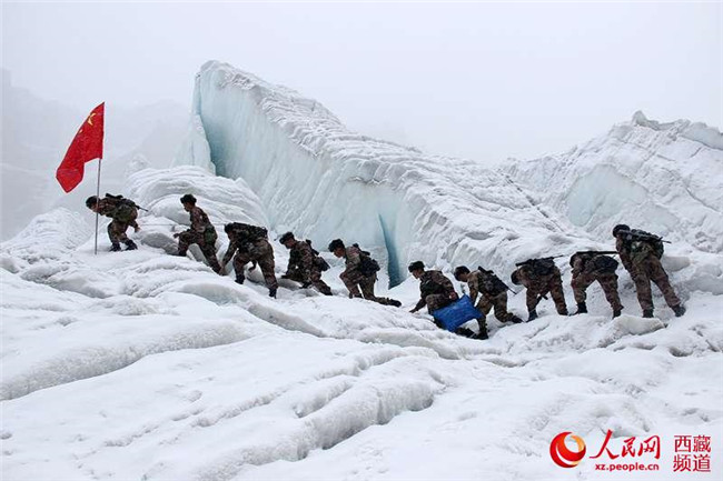 模范營(yíng)官兵在海拔6200多米的某冰川巡邏。羅凱 攝模范營(yíng)官兵在海拔6200多米的某冰川巡邏。羅凱 攝