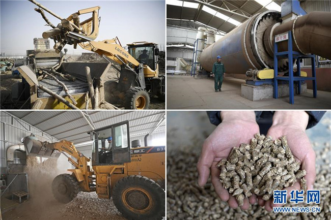 這是由11月27日拍攝的照片組成的拼版照片:左上圖為粉碎設(shè)備將秸稈、廢棄木材初步粉碎;右上圖為秸稈、廢棄木材經(jīng)過粉碎后進行烘干處理;左下圖為工作人員用鏟車將初步粉碎的渣料填入機器進行處理;右下圖為秸稈、廢棄木材制成的生物質(zhì)顆粒燃料。