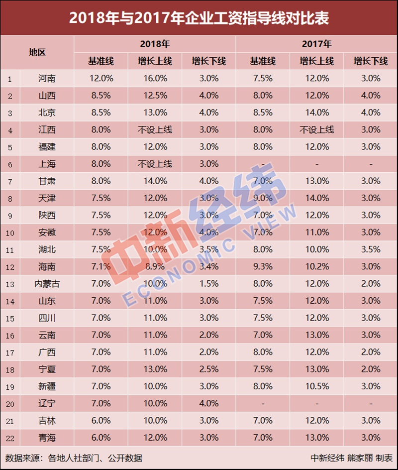 中新經(jīng)緯客戶端(微信公眾號:jwview)對比22省份2017年與2018年的數(shù)據(jù)發(fā)現(xiàn),除了上海、遼寧(2017年企業(yè)工資指導線不明確),今年多地企業(yè)工資指導線的基準線、上線和下線有所上調(diào)。