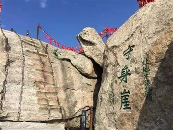 位于華山西峰頂摘星石北。民間傳說古時有個孝子,雙親身染重疾,久治不愈,聽說岳神靈驗(yàn),便登山拜神求醫(yī)。在向岳神祈禱的過程中,孝子許愿說只要雙親病愈,愿舍去自己的性命來報答神靈。果然,當(dāng)孝子返回家中時,父母都已康復(fù),且已下田耕作去了。孝子還愿來到華山,毫不猶豫的從此處跳下深淵,可他卻覺得身體若有人托起,似乘長風(fēng),飄飄欲仙。待清醒時,原來依然躺在家中,似夢非夢。孝子知道是華山神暗中相助,便告別父母到華山西峰作了道士。后人被孝子的誠心感動,就將此處命名為舍身崖。 清道光年間李榕的伯祖李仁龍為阻止后人仿效孝子的行為,改舍身崖為省身崖,以警示忤逆之街徒游到這里時應(yīng)對照孝子,自警自省,痛改前非。后來又有人認(rèn)為舍身救雙親的行為并不可取,也稱崖作守身崖,以教育后人生命可貴,不可輕擲。