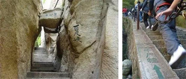 千尺幢,是經(jīng)華山峪登主峰的必經(jīng)之道。這里原為一崖間裂隙,直立70度,后來人們沿隙鑿?fù)爻陕罚惺A370級(jí),階寬僅容半足,游人登臨時(shí),仰視一線天,俯視若臨深井。百尺峽在“千尺幢上,也是巖隙險(xiǎn)道,有石階91級(jí),游人須挽索而上。有詩云:“幢去峽復(fù)來,天險(xiǎn)不可瞬,雖云百尺峽,一尺一千仞”。