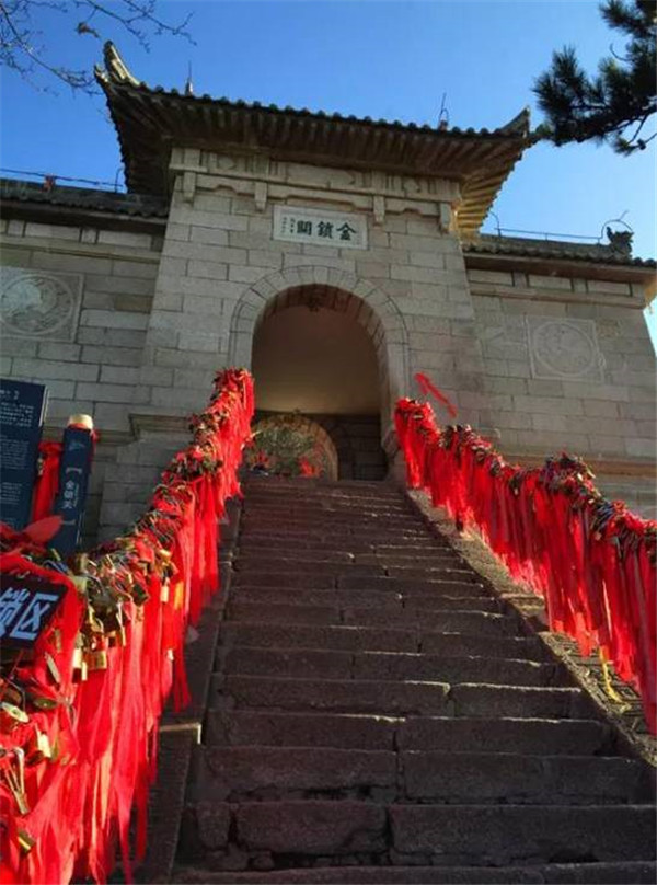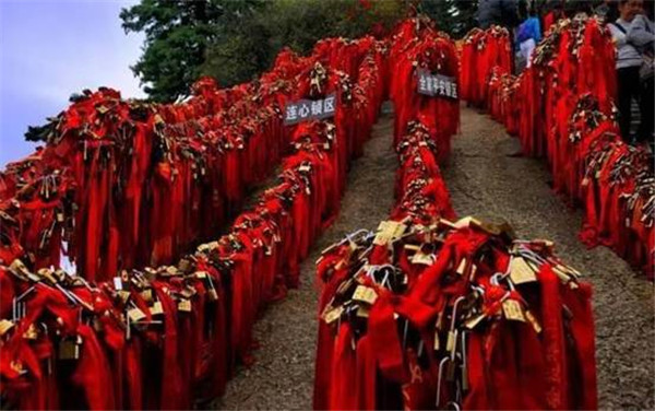 金鎖關——登山路兩側(cè)鐵索上情侶鎖,重重疊疊,紅繩彩線迎風搖曳,在這里,鎖住你們對愛情的誓言,表達隊愛情忠貞!