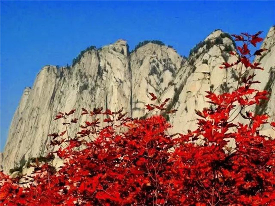 這是一個溫暖的美麗秋天,華山壯觀的峭壁在陽光下閃閃發(fā)亮,稀有樹木炫耀著多彩的秋葉,遠(yuǎn)方跳躍的瀑布吸引著游客的眼球,奇形怪狀的點(diǎn)點(diǎn)白云在腳下緩緩流動。我和我的朋友開始了一場艱苦的旅行,一起攀登6,600多級鑿在巖石上的臺階,目標(biāo)是海拔2154.9米南峰之巔祭祀華山神的道觀?! ?