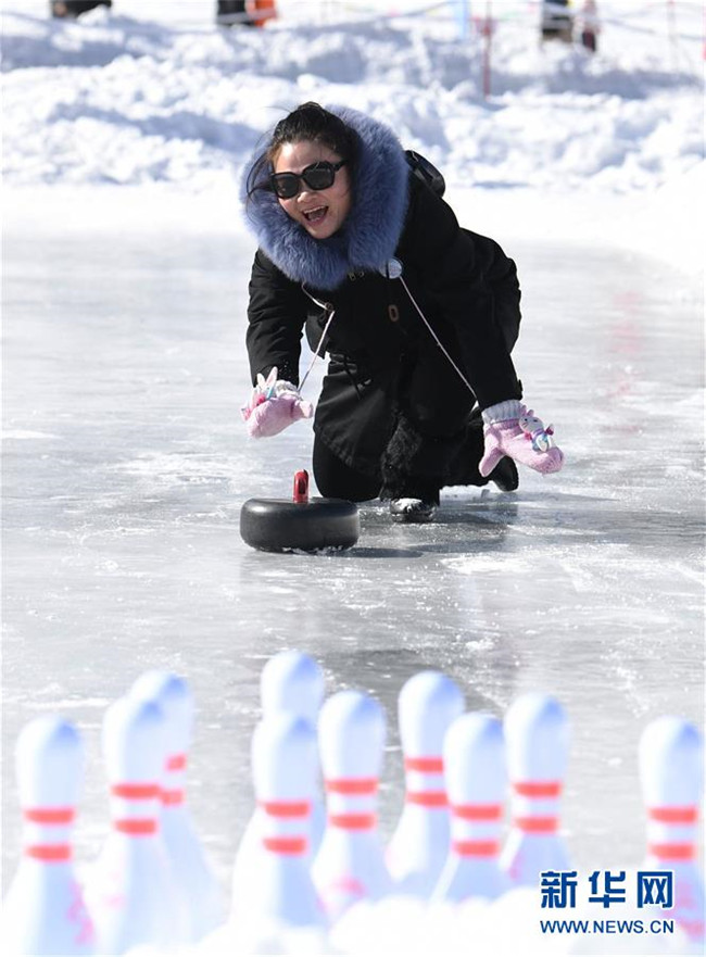 2月17日,一名游客在新疆天池景區(qū)玩冰上保齡球。 2018年入冬至2019年2月17日,新疆天池景區(qū)接待游客23萬(wàn)人次,實(shí)現(xiàn)旅游經(jīng)濟(jì)收入2.25億元。新疆天池景區(qū)著力發(fā)展冬季旅游,為游客提供優(yōu)質(zhì)冰雪旅游體驗(yàn),逐漸將天池“冷資源”變成“熱經(jīng)濟(jì)”。 新華社記者沙達(dá)提攝