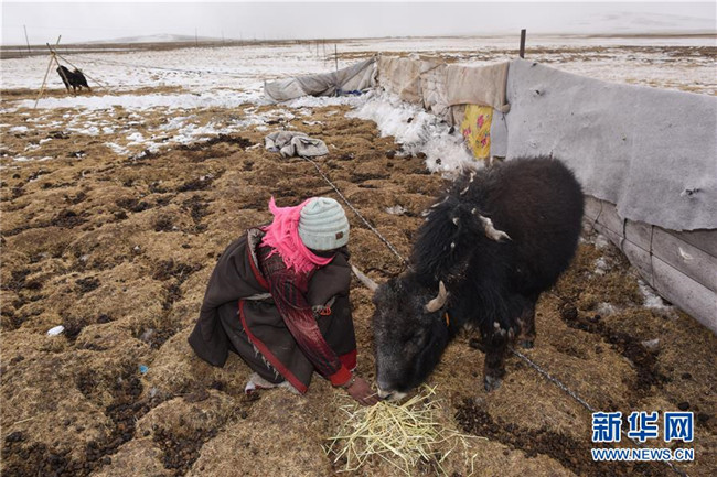 2月22日,一名轉(zhuǎn)場(chǎng)過(guò)來(lái)的藏族婦女在麥雄灘上給牛喂飼草料。新華社記者吳剛攝