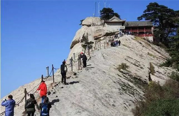 而被大家熟悉的長(zhǎng)空棧道,則位于華山南峰東側(cè)山腰,是華山派第一代宗師元代高道賀志真為遠(yuǎn)離塵世靜修成仙,在萬(wàn)仞絕壁上鑲嵌石釘搭木椽而筑。去過(guò)華山的朋友,大部分肯定體驗(yàn)過(guò)華山長(zhǎng)空棧道,在千仞絕壁之上,左邊是大山,而右邊就是萬(wàn)丈深淵,想要通過(guò)僅僅是靠著腳下這一寬30多公分的棧道,周?chē)鸁o(wú)任何欄桿,但令人興慶的是,在崖上還有釘?shù)睦喂痰蔫F索可以抓住,讓探險(xiǎn)者可以稍微放松一點(diǎn)心情。