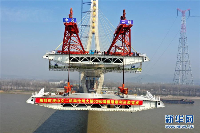 3月13日,在安徽池州長江公路大橋建設(shè)現(xiàn)場,中交二航局施工機(jī)械在吊裝鋼箱梁(無人機(jī)拍攝)。新華社發(fā)(過仕寧 攝)