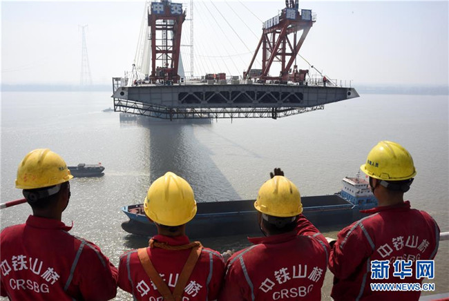 3月13日,在安徽池州長江公路大橋建設(shè)現(xiàn)場,施工人員在關(guān)注鋼箱梁吊裝進(jìn)度。新華社發(fā)(過仕寧 攝)