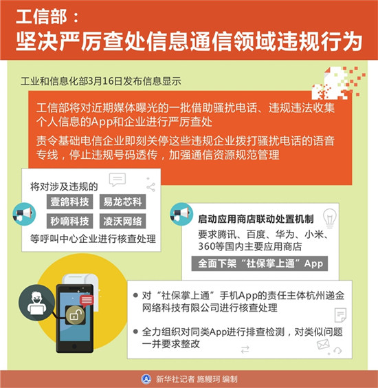 工業(yè)和信息化部16日發(fā)布信息顯示,工信部將對(duì)近期媒體曝光的一批借助騷擾電話、違規(guī)違法收集個(gè)人信息的App和企業(yè)進(jìn)行嚴(yán)厲查處,責(zé)令基礎(chǔ)電信企業(yè)即刻關(guān)停這些違規(guī)企業(yè)撥打騷擾電話的語音專線,停止違規(guī)號(hào)碼透?jìng)鳎訌?qiáng)通信資源規(guī)范管理。