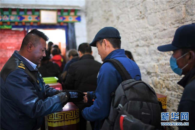 布達(dá)拉宮的安檢人員在核對參觀者的門票、身份證件等(2018年11月15日攝)。 新華社記者 普布扎西 攝