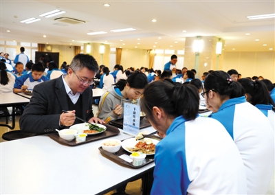 “我可以坐在這兒嗎?”3月25日中午,海淀區(qū)教師進(jìn)修學(xué)校附屬實(shí)驗(yàn)學(xué)校校長董紅軍在學(xué)生窗口打完飯后,找了一個(gè)位置坐下。記者了解到,今年2月份,學(xué)校開始實(shí)行副校級(jí)干部的輪流陪餐制度,董紅軍是當(dāng)日輪崗的干部。