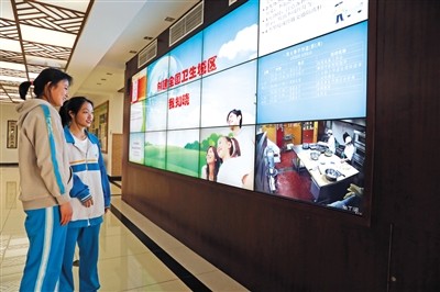 海淀教師進(jìn)修學(xué)校附屬實(shí)驗(yàn)學(xué)校(北校區(qū))大屏幕實(shí)時(shí)直播后廚情況。 新京報(bào)記者 王遠(yuǎn)征 攝