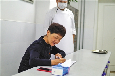 安樂幼兒園園長張萍試吃幼兒午餐并進(jìn)行記錄評(píng)價(jià)。新京報(bào)記者 馮琪 攝