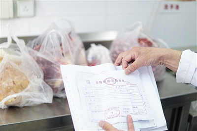 安樂幼兒園食堂管理員查驗(yàn)動(dòng)物檢疫合格證明等。新京報(bào)記者 馮琪 攝