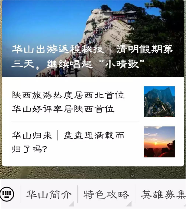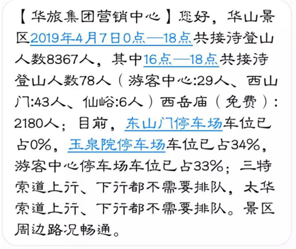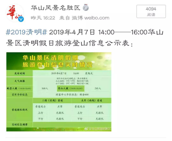 景區(qū)節(jié)日期間通過電子大屏、官方微博、微信、短信平臺向游客和各單位提供實時登山排隊人數(shù)、車位、天氣等信息。(小長假期間新浪微博共計發(fā)送微博48條,網友留言及回復361條,閱讀量共計421446余次;微信公眾平臺共計發(fā)送18篇軟文報道,分享及轉發(fā)量共計1098次,閱讀量共計10272次;短信平臺共計發(fā)送2394條短信,及時匯報各項旅游信息)。