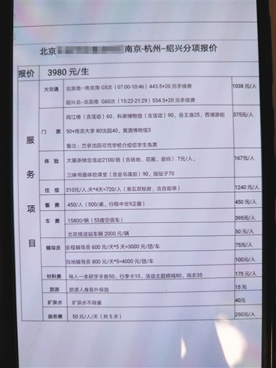 學(xué)生家長提供的北京某中學(xué)初一年級南方研學(xué)游報(bào)價(jià)明細(xì)。記者 黃哲程 攝