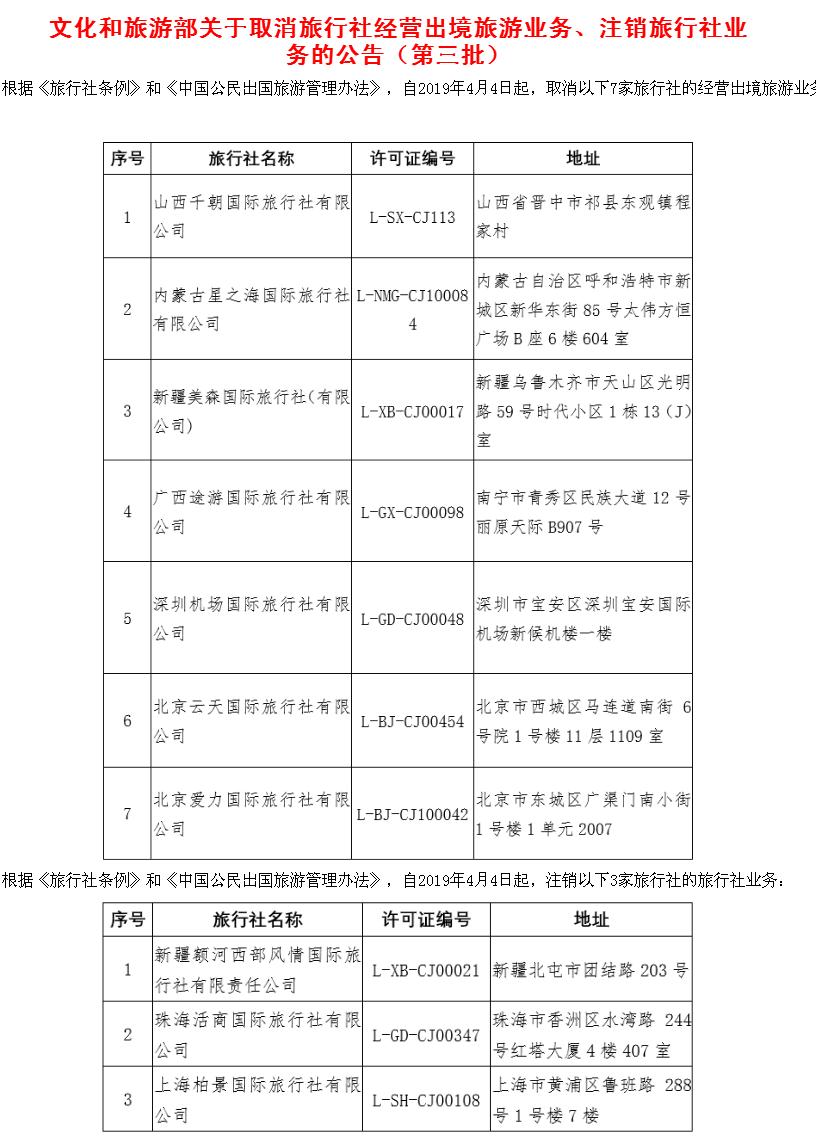 文化和旅游部近日發(fā)布公告,取消7家旅行社的經營出境旅游業(yè)務,注銷3家旅行社的旅行社業(yè)務。記者注意到,截至目前,今年文化和旅游部共取消30家旅行社的出境游業(yè)務、注銷11家旅行社的旅行社業(yè)務。戳圖看詳細黑名單。